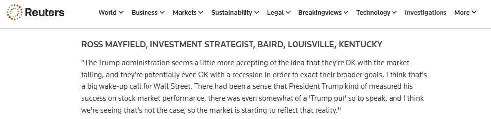 投资分析师罗斯·梅菲尔德表示,特朗普9日的言论似乎表现出其针对当前股市下行的趋势是可以接受的。为了实现某些特定的执政目标,特朗普政府甚至可能对“经济衰退”感到满意,此前华尔街一贯认为特朗普政府在股市上需要获得成功,而这样的变化为华尔街的投资者敲响了警钟。