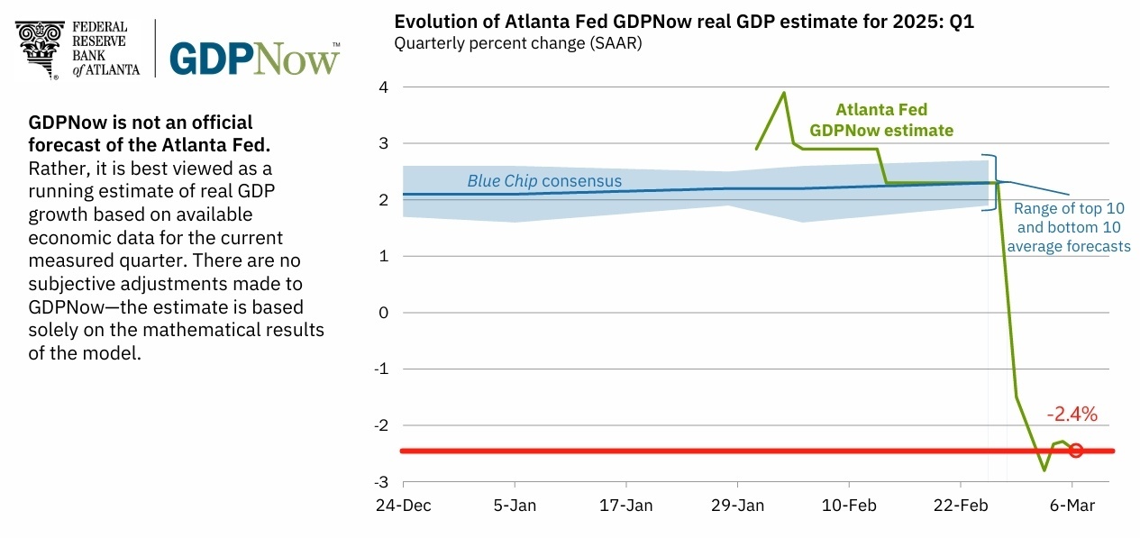 按照广义的定义,连续两个季度经济负增长通常被认为是经济衰退的信号,而当前美国经济已经显现出了衰退的迹象。根据美国亚特兰大联储的GDPNow模型早在3月6日的预测——美国2025年第一季度国内生产总值将萎缩2.4%。