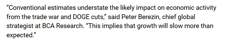 彼得·博瑞辛在10日公布的报告中表示,贸易战和美国政府效率部的行动将造成的影响还未充分显现,经济增长极有可能还将进一步放缓。