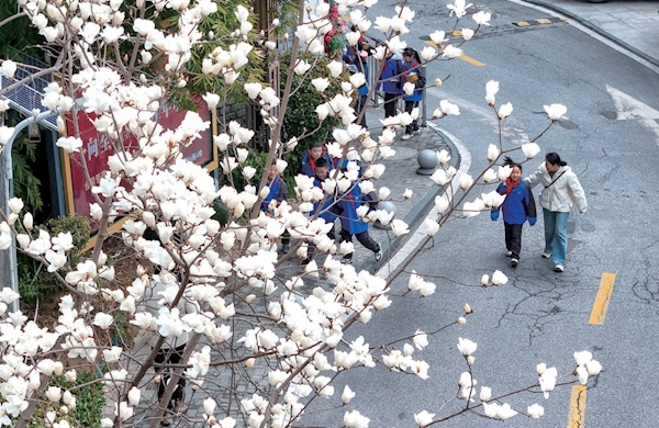 漫步北京路,不经意便能与玉兰花相遇。街边玉兰树,或孤植亭亭玉立,或数十棵连片形成花海。它们与蓝天、建筑、步道交相辉映,构成一幅幅动静相宜的美丽画卷。