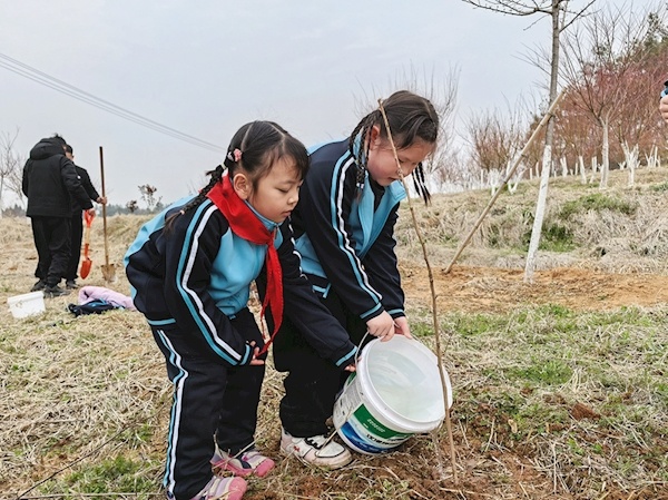 3月9日,广水市实验小学二(9)班的学生与家长来到长岭镇云台村,开展了“植一抹绿色 溢一片春光”亲子植树活动。每位学生认真填写了《自然与植物研学手册》,了解了大树的生长过程。随后,孩子们认真地将树苗放到树坑里,与父母一起挥锹培土,种下了30余株樱桃树苗。(随州日报通讯员高晓涵、王小菊摄)