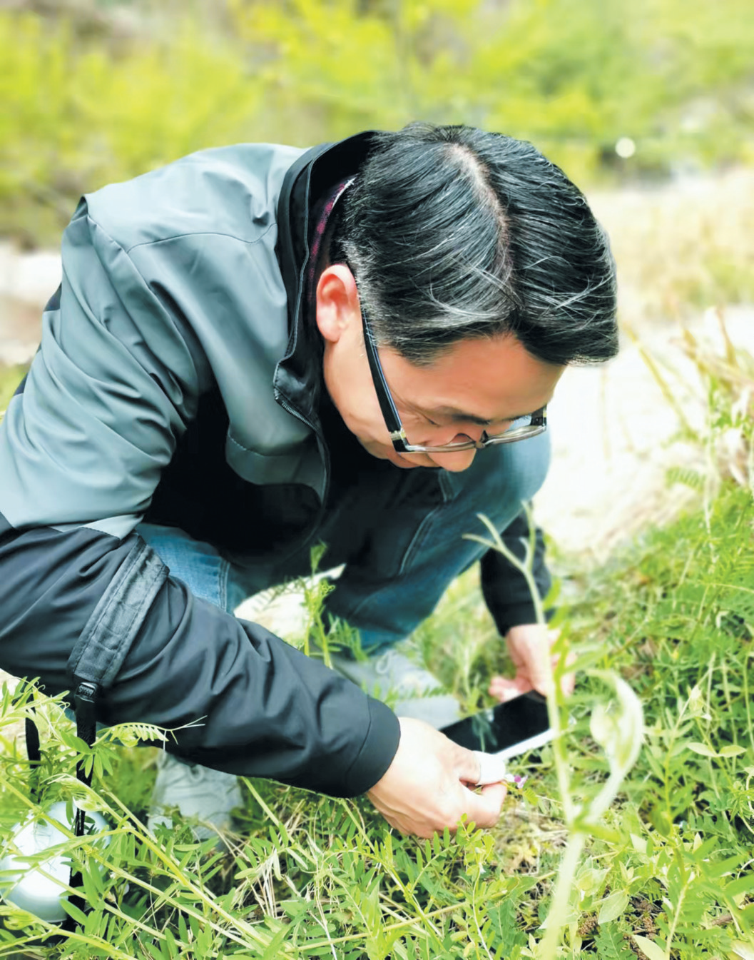 张忠文在野外进行植物调查。