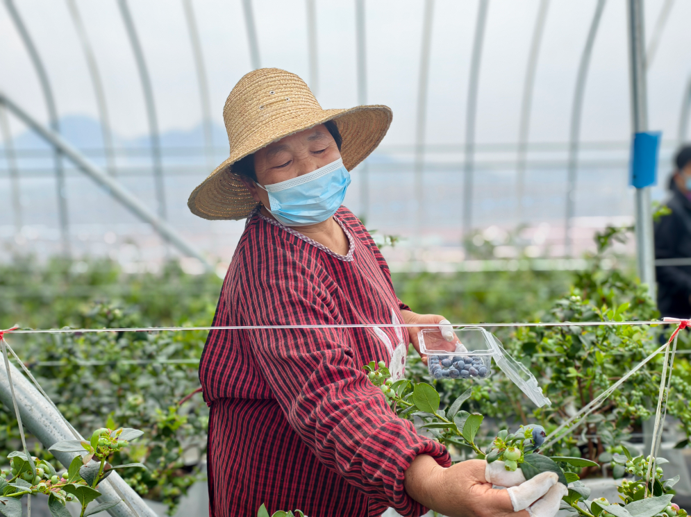 近日,记者走进林丰蓝莓生态园的智能大棚内,一股清新的香气扑鼻而来,4000株盆栽蓝莓树长势喜人,一颗颗裹着白色果霜的蓝莓缀满枝头,令人垂涎欲滴。几位村民手持塑料篮子,穿梭其间,正忙着采摘成熟的果实。
