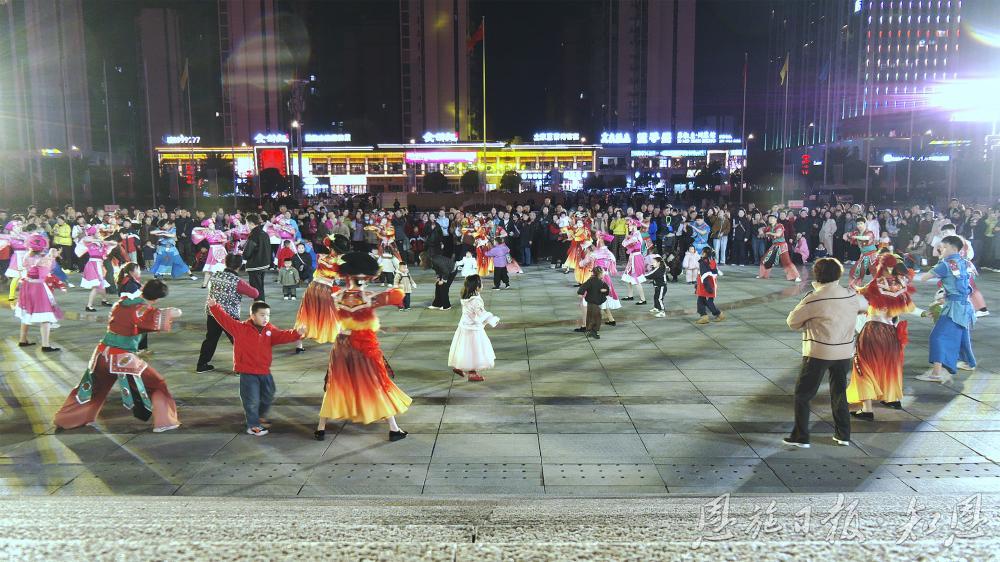 当迎宾曲响起,恩施广场上,身着民族服装的演员跳起摆手舞,一招一式充满韵律,来自五湖四海的游客跟着演员们的样子摆手、转身,感受土家摆手舞的魅力。