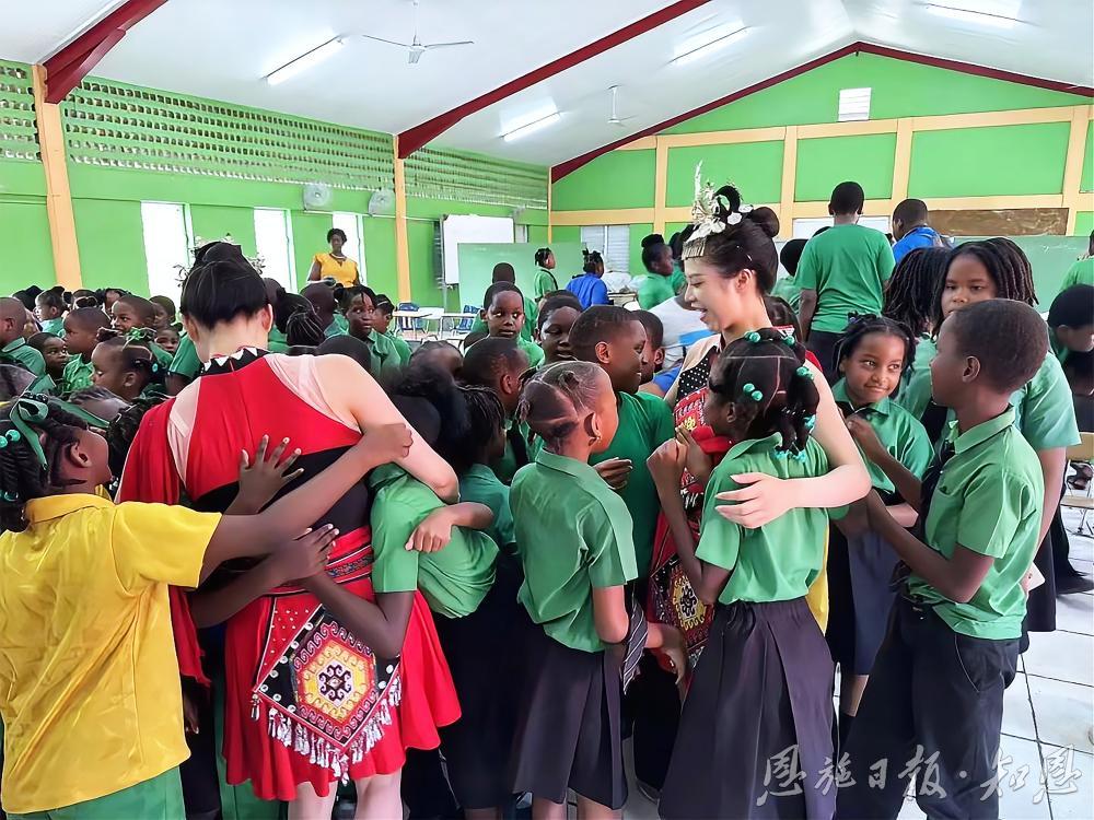 歌舞剧《 西兰卡普 》演员与多米尼克的孩子们亲切交流。(湖北省民族歌舞团 供图)