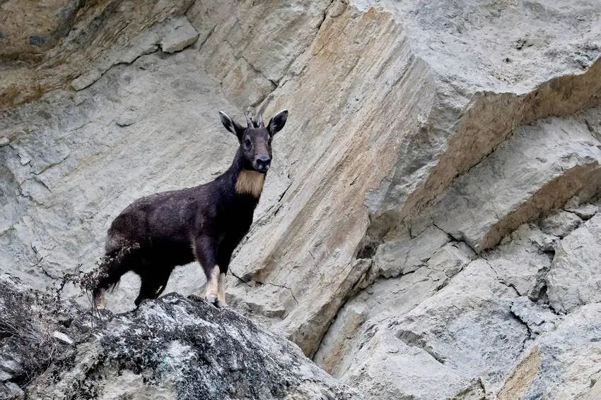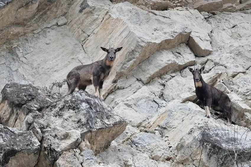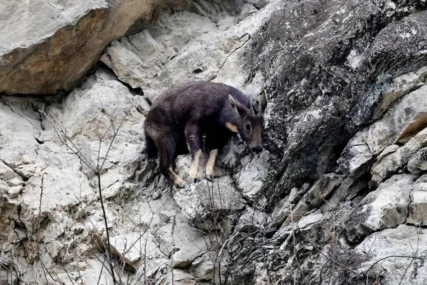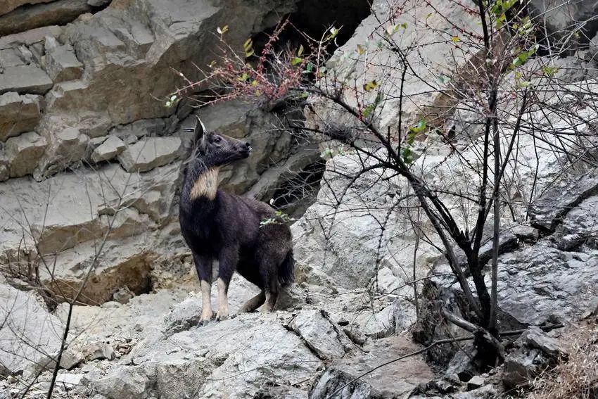 近日,热心群众在襄阳市保康县封银岩桥附近的山崖边,意外发现了几只“野山羊”,后经湖北五道峡国家级自然保护区管理局专业人员鉴定,此动物为国家二级重点保护动物中华斑羚。