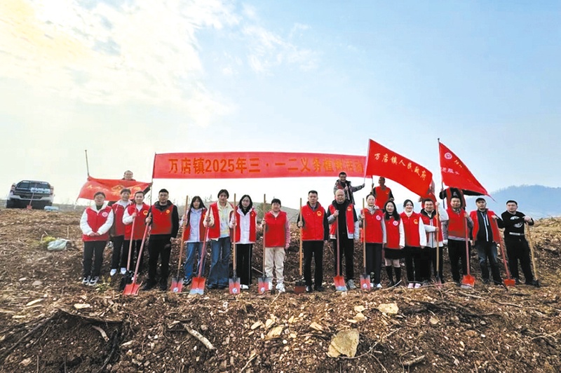 3月12日,为推进“清洁家园”行动进一步走深走实,曾都区万店镇在落天坡村百材园组织开展2025年义务植树活动,为乡村增绿添彩,助力生态宜居美丽乡村建设。经过一个多小时的辛勤劳动,400余棵油茶苗迎风而立,苗株成行,错落有致,在明媚的春光中展现出勃勃生机。(随州日报通讯员郝雪婷摄)