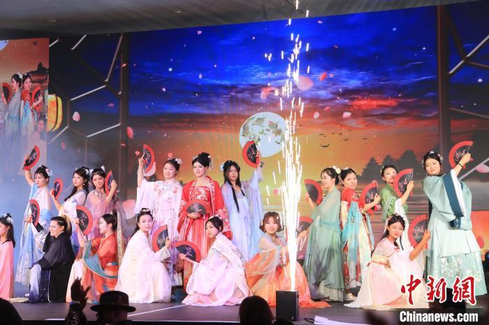 3月15日,“聆听她的声音——庆祝2025国际劳动妇女节主题文艺晚会”在南非约翰内斯堡举行。图为南非侨胞展演汉服秀《寄明月》。(中新网记者 孙翔 摄)