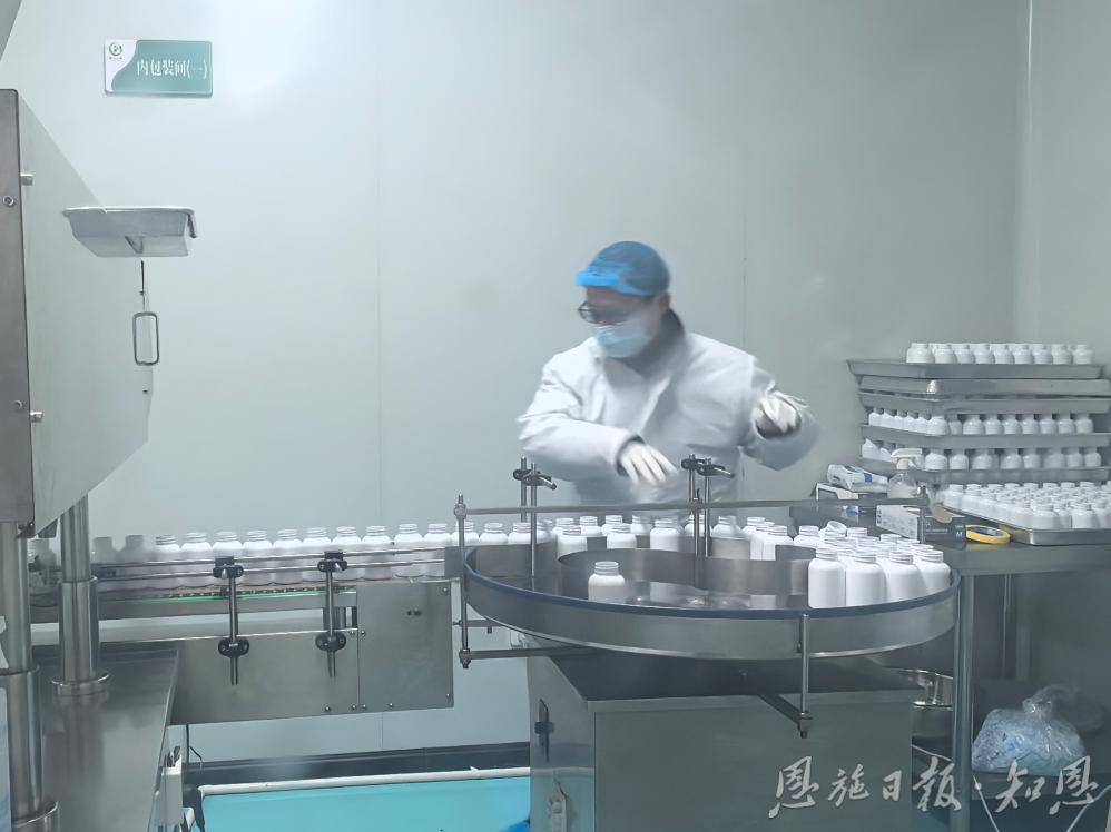 位于恩施市七里坪街道的恩施映马生物工程有限公司净化车间生产线上,硒片加紧生产。蒲丹 摄