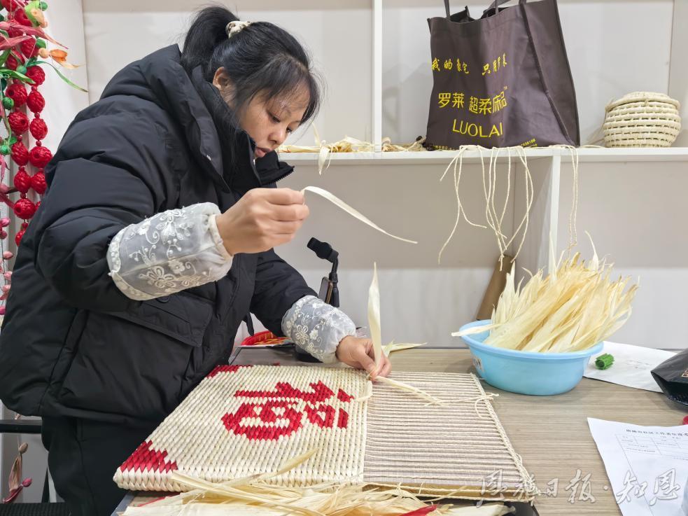 玉叶公司车间,贵州籍妇女杨世琴专注地用包谷叶编坐垫。“每个月工资3000元到6000元不等,上班时间自由,方便照顾孩子,我挺满足。”