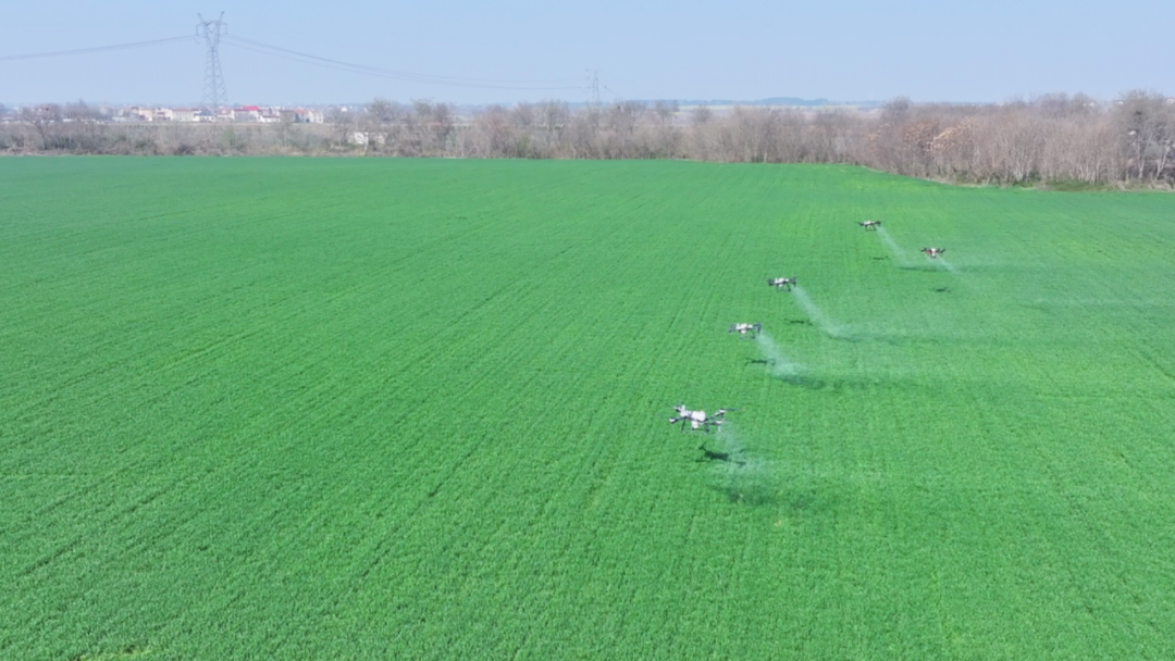 在孝昌县陆西村,1000余亩连片麦田绿意盎然,长势喜人。伴随着螺旋桨的轰鸣声,5台植保无人机腾空而起,向下均匀喷出药肥水雾,为小麦防虫治病和后期生长补给营养。千亩麦田,不到两小时便喷洒完毕。无人机作业搭载北斗导航系统,真正实现了“一机多能”,既能精准喷药、高效施肥,还能实时监测农作物生长,科学又高效。