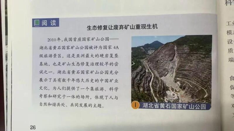翻开七年级地理课本第26页,题为《生态修复让废弃矿山重现生机》的阅读篇目记录“黄石国家矿山公园充分展示了具有数千年悠久历史的中国矿业文化……”