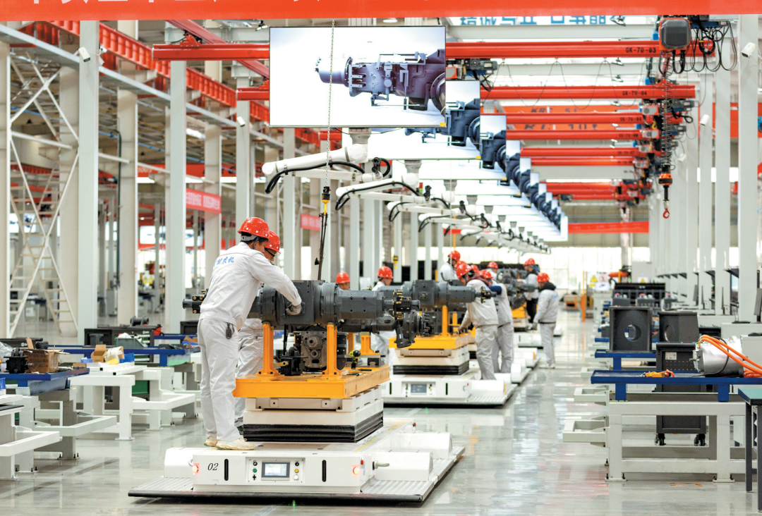 工人在十堰国科鸿鹄科技有限公司智能农机柔性生产线旁,生产智能农机设备。记者 刘昆 摄