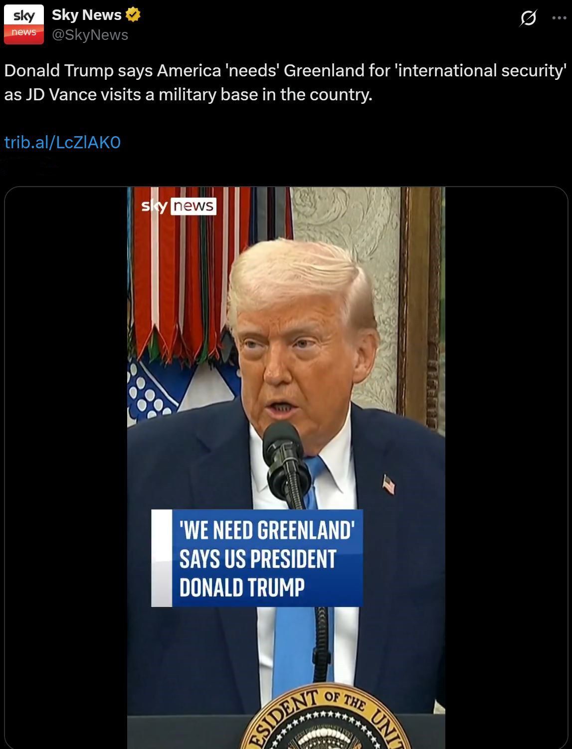 针对格陵兰岛各界将万斯28日的到访视为“一种危险的挑衅”,特朗普辩称,美方代表团的访问“是友好的,不是挑衅”。