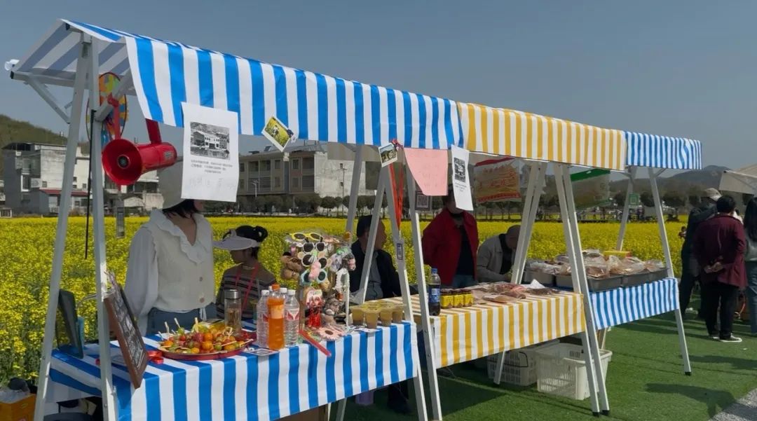 在赏花节现场,农户摊位上的麦市干子、糖葫芦、烤肉等美食和农特产品在金色花海的映衬下显得格外诱人,吸引游客们驻足品尝,纷纷扫码购买。当地农户抓住赏花季契机,将农特产品与赏花旅游相结合,推出了一系列特色产品,如春笋、土鸡蛋、菜籽油等,深受游客喜爱。