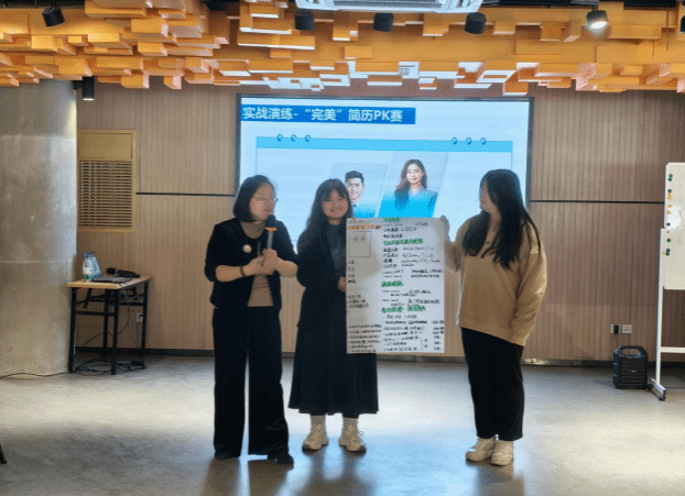 首期培训聚焦求职核心技能,资深职业规划导师文菲围绕“简历优化”与“面试策略”展开授课,深入浅出地讲解了HR筛选简历的三字诀及职位JD解构的三要素,通过案例分析演示如何精准匹配简历与职位要求。在实战环节,学员分组限时制作简历并进行展示,文菲老师逐一点评,最终由全体学员共同评选出“最佳简历”。针对面试环节,她将流程拆解为“逻辑化自我介绍”“压力问题拆解”及“反向提问”三部分,强调“主动掌控沟通节奏”的重要性。