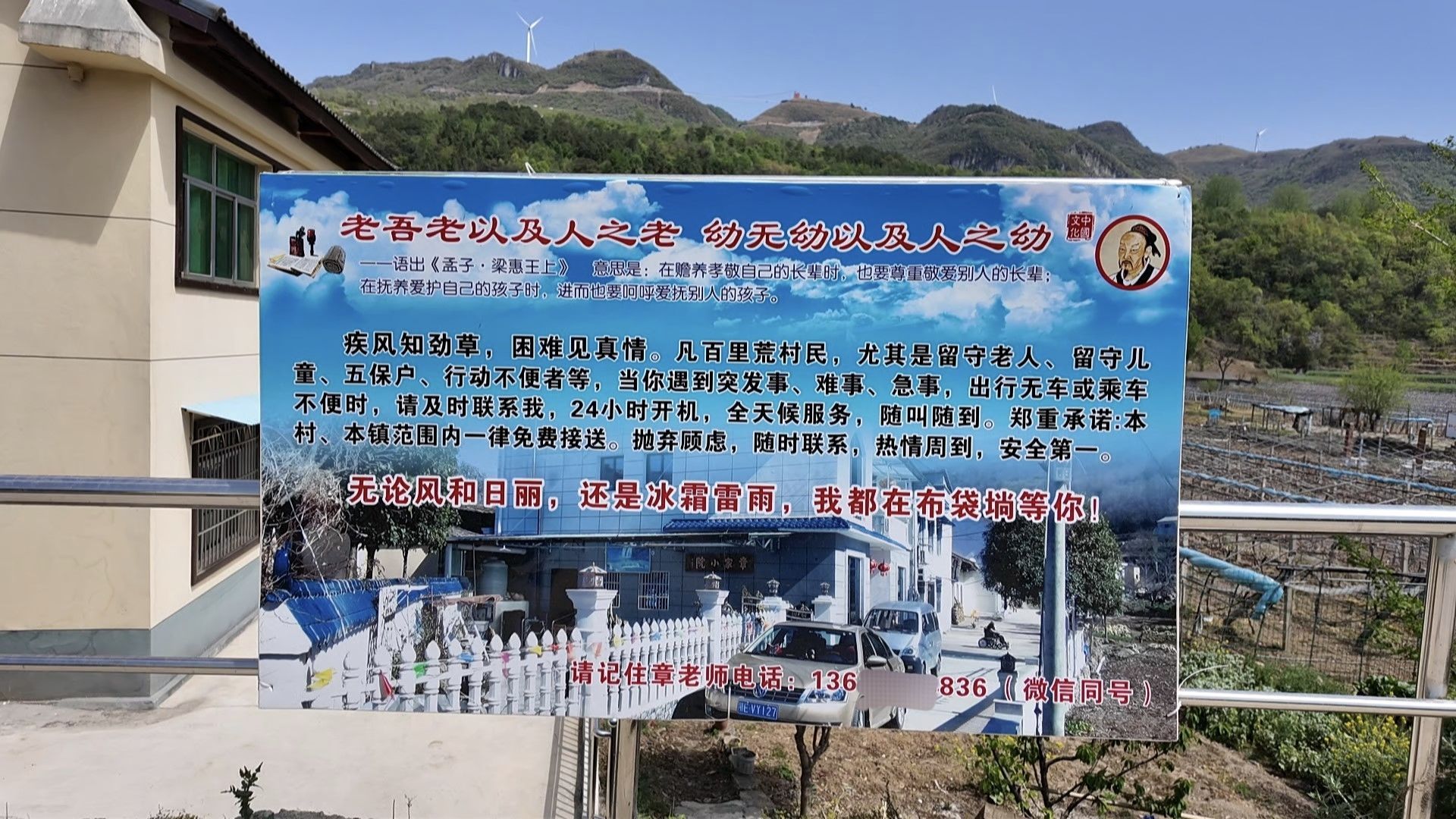 “从今日起,凡是本村村民生病就医、买东西、拖东西、走亲戚、学生到校上学、放假回家等,或遇到突发事件、出行没车或搭车不方便等困难,老人的子女或孩子的父母又不在身边的,请随时联系我,我24小时开机,只要你需要,我就立马到你身旁!”章元明在公开信里作出郑重承诺,并将内容做成告示,张贴在村里3处公共场所。