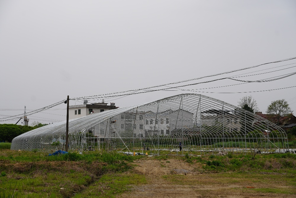 淦河畔机器轰鸣,高赛村北岸两座银白色的巨型建筑正拔地而起。23米跨度的弧形钢结构划出优美曲线,两座长80米、高6米的银色大棚骨架已具雏形。