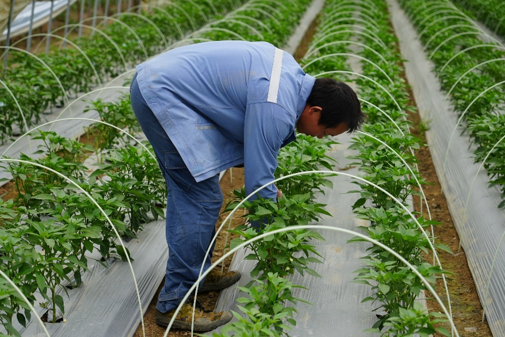 顺着她手指的方向,三个占地六亩的育苗大棚里,负责人王仁全正弓着腰检查辣椒长势。