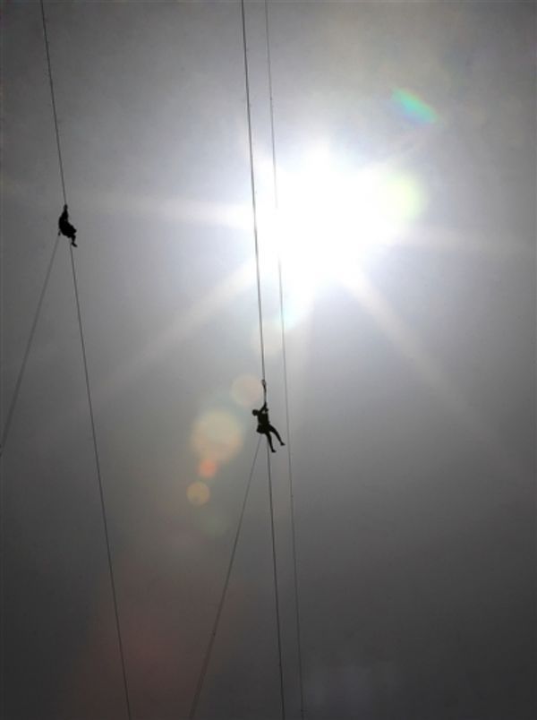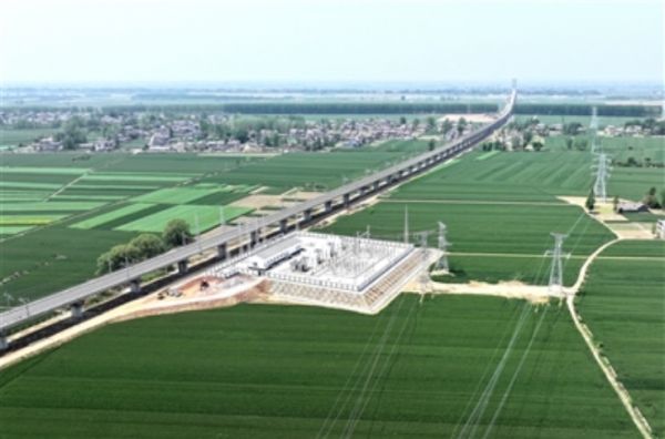 4月18日,国网荆门供电公司建设人员正紧张开展沪渝蓉高铁钟祥南牵引站220千伏外部供电工程汉江大跨越线路附件安装。