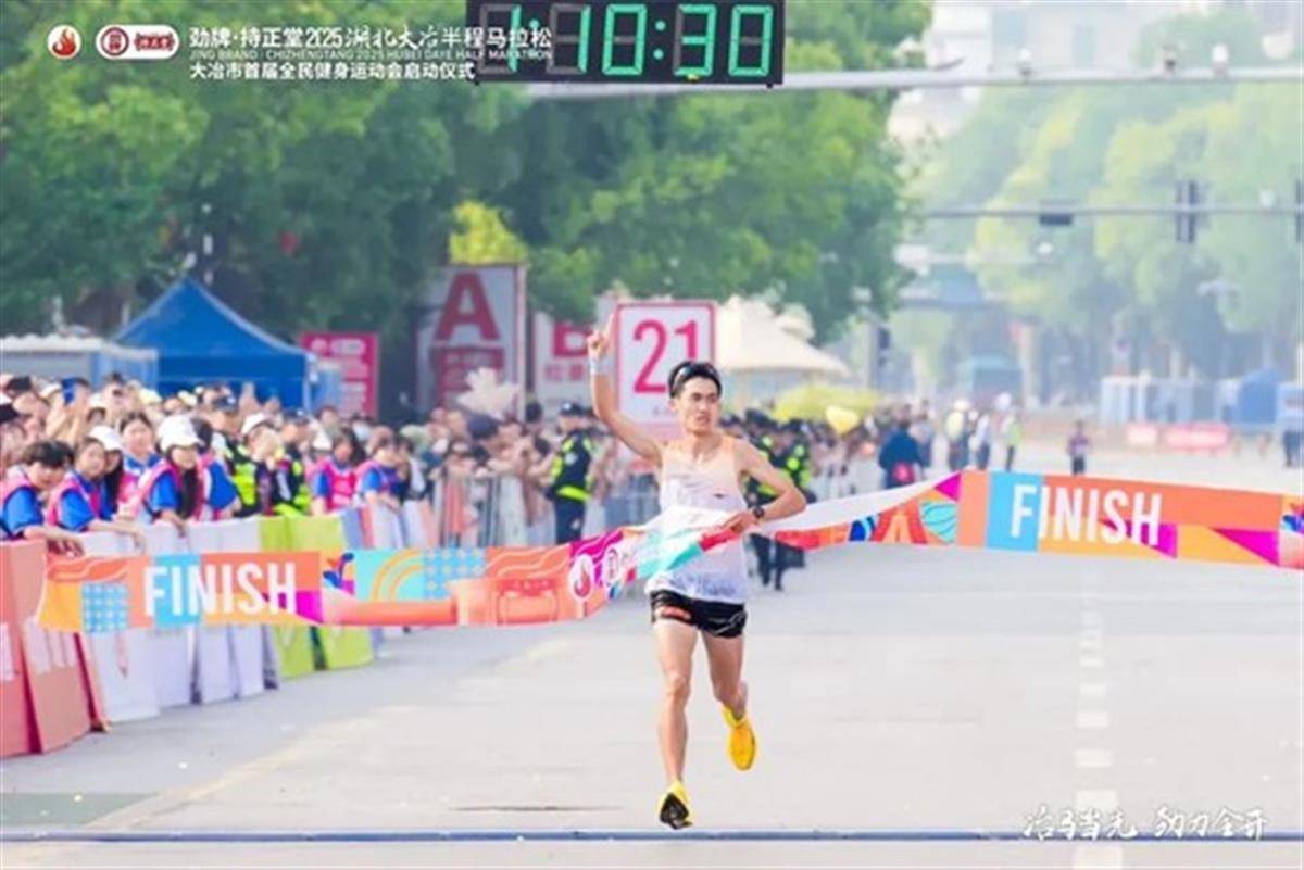 经过一个多小时的角逐,大冶本土选手曹欢率先冲线,以1小时10分30秒的成绩,获得半程马拉松男子组冠军,喻桐以1小时11分26秒的成绩获得第二名,陶江义以1小时12分28秒的成绩获得第三名。