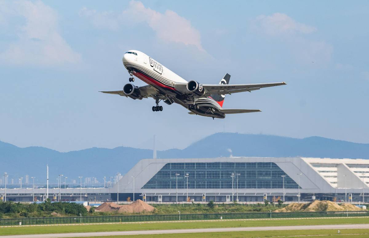 7月5日,一架B767-300型全货机从鄂州花湖国际机场起飞,前往印度新德里。(湖北日报全媒记者 薛婷 摄)