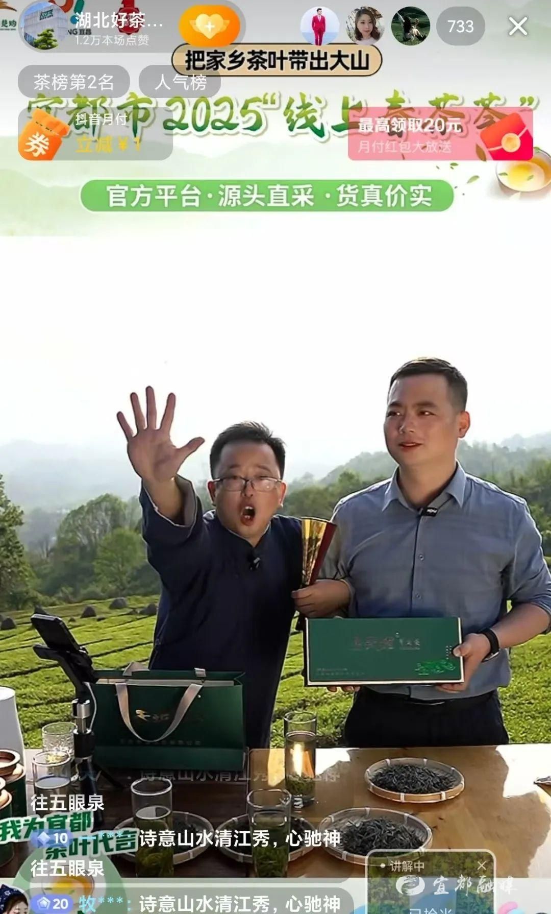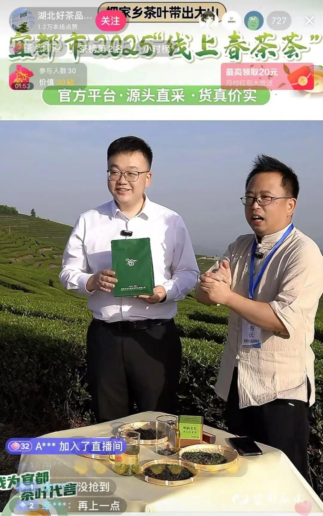 由宜都市经商局牵头,联合宜都市农业农村局等4个部门、5个产茶乡镇、3大协会及12家茶企的宜都市2025“线上春茶荟”暨茶叶产销对接活动,在抖音平台“湖北好茶馆”账号进行公益助农直播,自3月31日启动以来,20天内交出亮眼答卷:170万人次观看量,65万元销售额,省外订单占比突破50%。