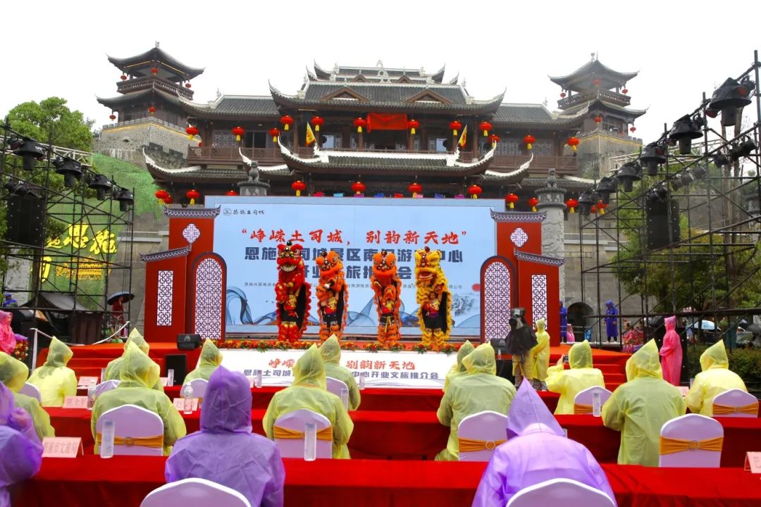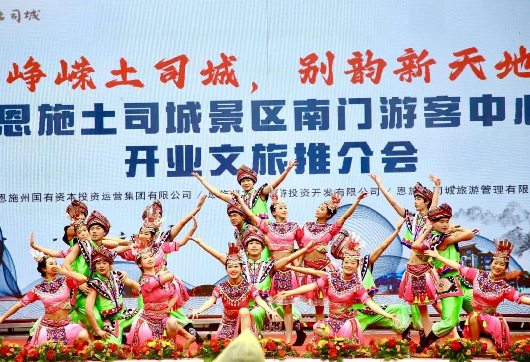 当日,恩施土司城景区南门游客中心开业文旅推介会举行。恩施土司城南门广场上,土家歌舞激情上演,民俗活动精彩不断。