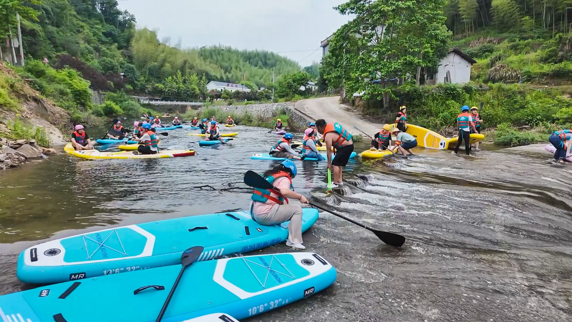 崇阳港湍急段与平缓段交错分布,水质清澈,为桨板运动提供了绝佳条件。当天,游客们从崇阳港上游出发,他们双手持桨,脚踏各色桨板,驰骋在水面。在约两个小时的漂流时间里,游客们一边饱览两岸秀美风光,一边体验桨板运动带来的快乐。