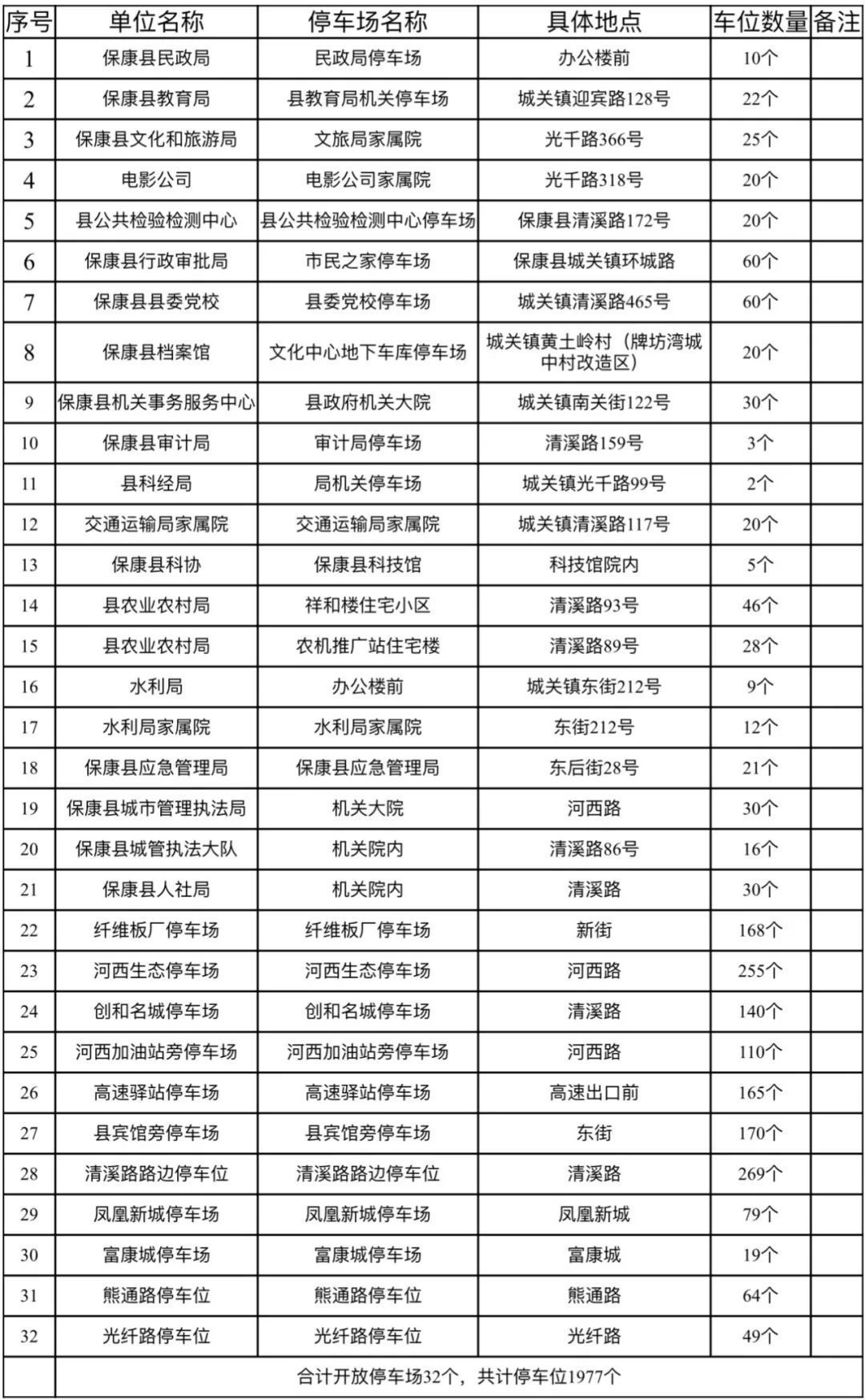 保康县城范围内道路两旁所有行政机关、企事业单位、人民团体(县人武部、公安、检察院、法院、消防大队、金融机构、学校除外)内部停车场。