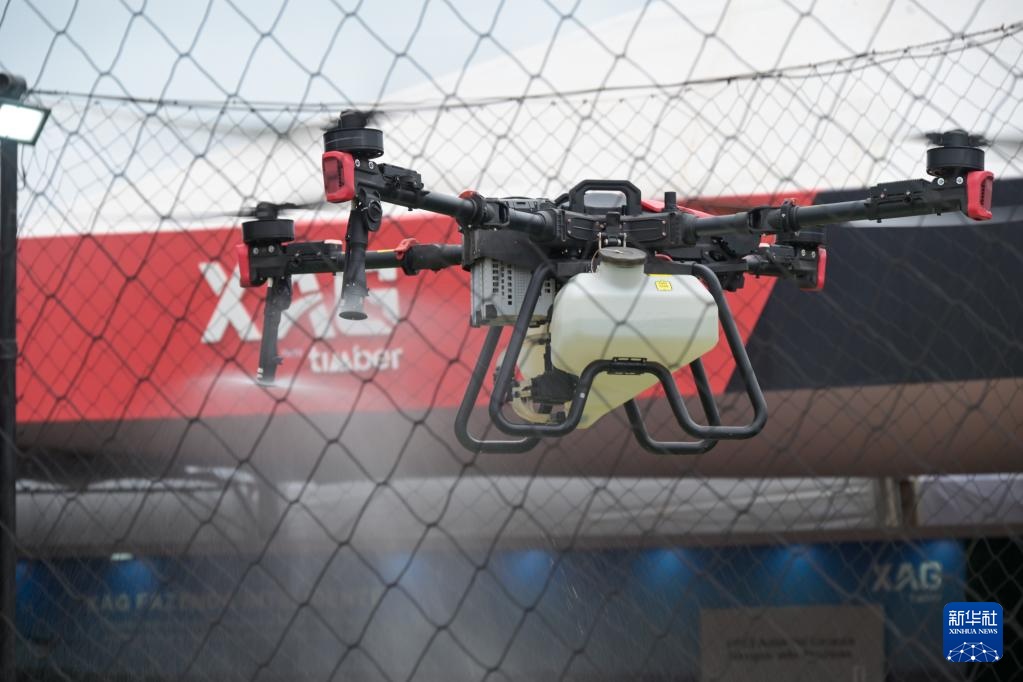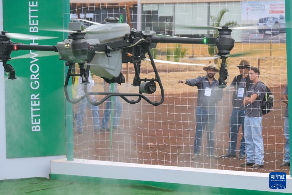 4月29日,在巴西圣保罗州里贝朗普雷图市举行的2025年巴西农业科技展上,一架极飞农业无人机进行喷洒演示。新华社记者 陈昊佺 摄