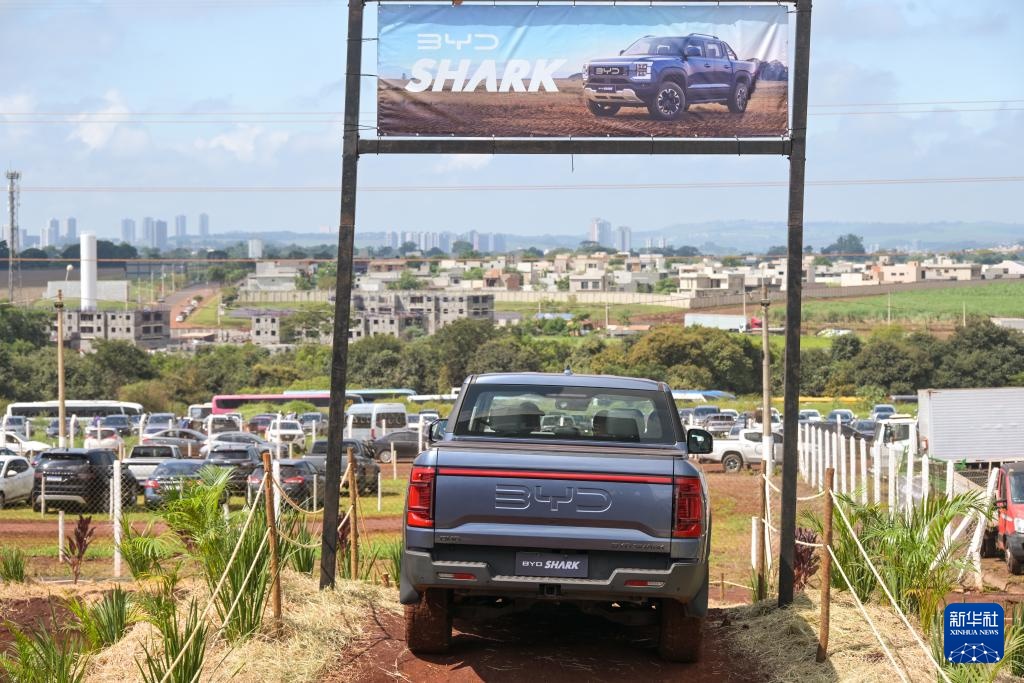 4月29日,在巴西圣保罗州里贝朗普雷图市举行的2025年巴西农业科技展上,一辆比亚迪皮卡进行越野演示。新华社记者 陈昊佺 摄