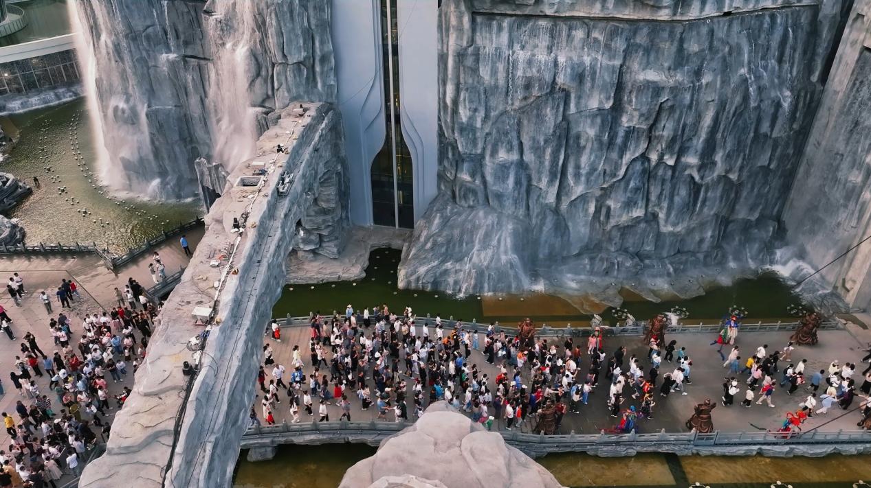 每晚7时许,园区大剧院外护城河波光潋滟,崖壁瀑布飞泻如练。随着武当山龙头香幻化的“土地公”一声号令,“六丁六甲神将”阵列天门,重达数吨的吊桥在声光特效中缓缓落下。游客们踏桥“入城”,与“神将”互动合影,仿若穿越至道家秘境。园区负责人介绍:“从踏入城门起,游客便成为故事的主角。吊桥仪式还原了古代城池礼制,结合道教的威严,配合现代声光电技术,实现‘一秒入戏’的沉浸感。”
