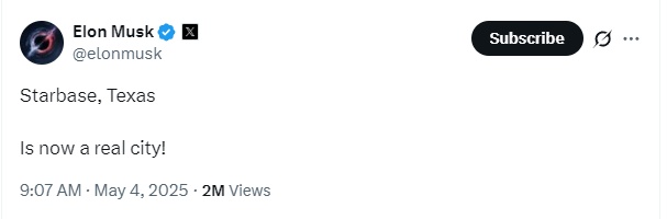 太空探索技术公司首席执行官埃隆·马斯克在社交媒体发文:“得克萨斯的星舰基地,现在是一座真正的城市了!”。