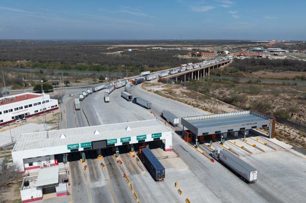 2月15日,在墨西哥新莱昂州哥伦比亚镇,货车通过一处边检站后,准备从国际桥跨越格兰德河进入美国。墨美两国边界长度超过3100公里,东段主要以格兰德河为界。新华社记者李梦馨摄