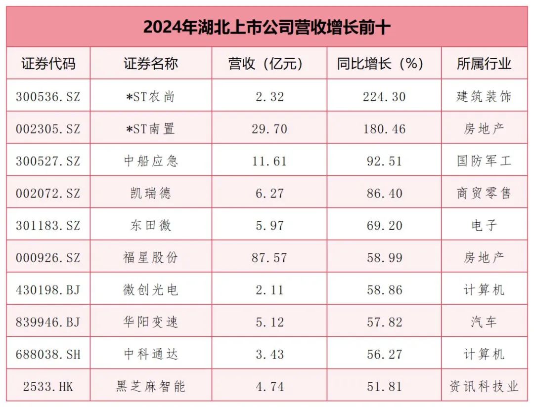 *ST南置、中船应急、凯瑞德、东田微、福星股份、微创光电、华阳变速、中科通达、黑芝麻智能依次位列其后,营收均增长超50%。