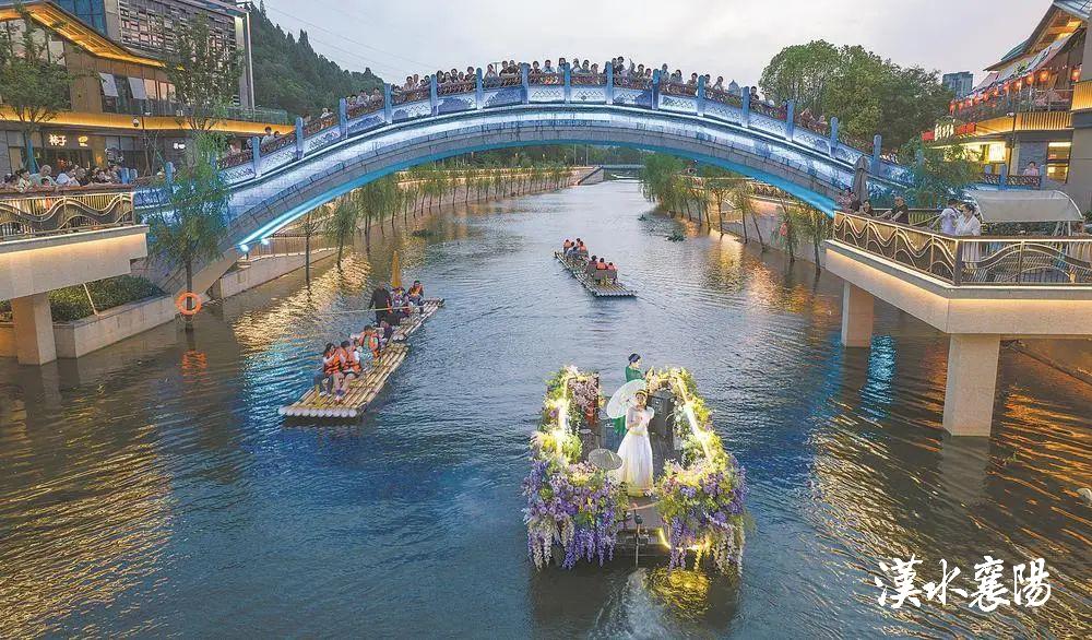 5月2日晚,游人在襄水街观看《梦回襄水》水上演艺。