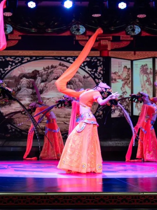 主楼广场前,春晚同款《凤舞九天》演出开启,15位身着华丽服饰的舞者舞姿灵动优雅,仿佛凤凰展翅高飞。“太美了!”游客们发出赞叹声。现场不仅有来自重庆、西安、大连……的游客,还有来自意大利、英国……的外国游客,大家纷纷鼓掌叫好。