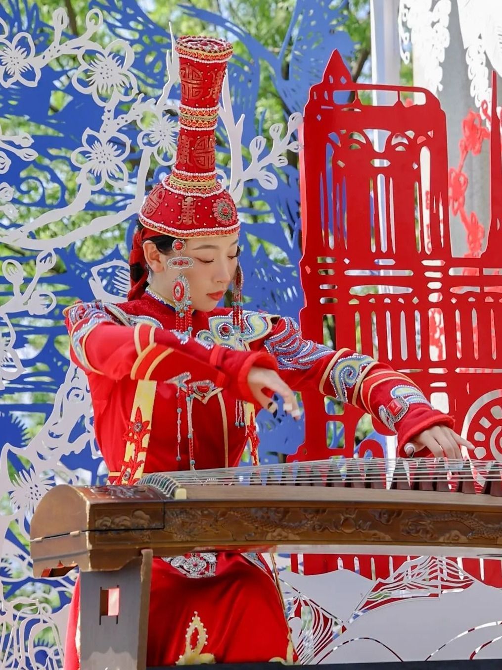 在园区,岳飞广场上演《精忠报国》乐舞演出。白云阁可以观展,邂逅中法剪纸艺术光影交织的浪漫。涌月台上,《鹤鸣九皋》古筝演奏唯美动听。搁笔亭可以对诗,落梅轩看《鹤舞楚天》编钟乐舞。无论是《凤舞九天》对楚文化的现代表达,还是中法剪纸艺术展的文化对话,都展现了中国传统文化开放包容的特质。这种立足于本土又面向世界的姿态,正是“新质旅游”应有的文化气质。