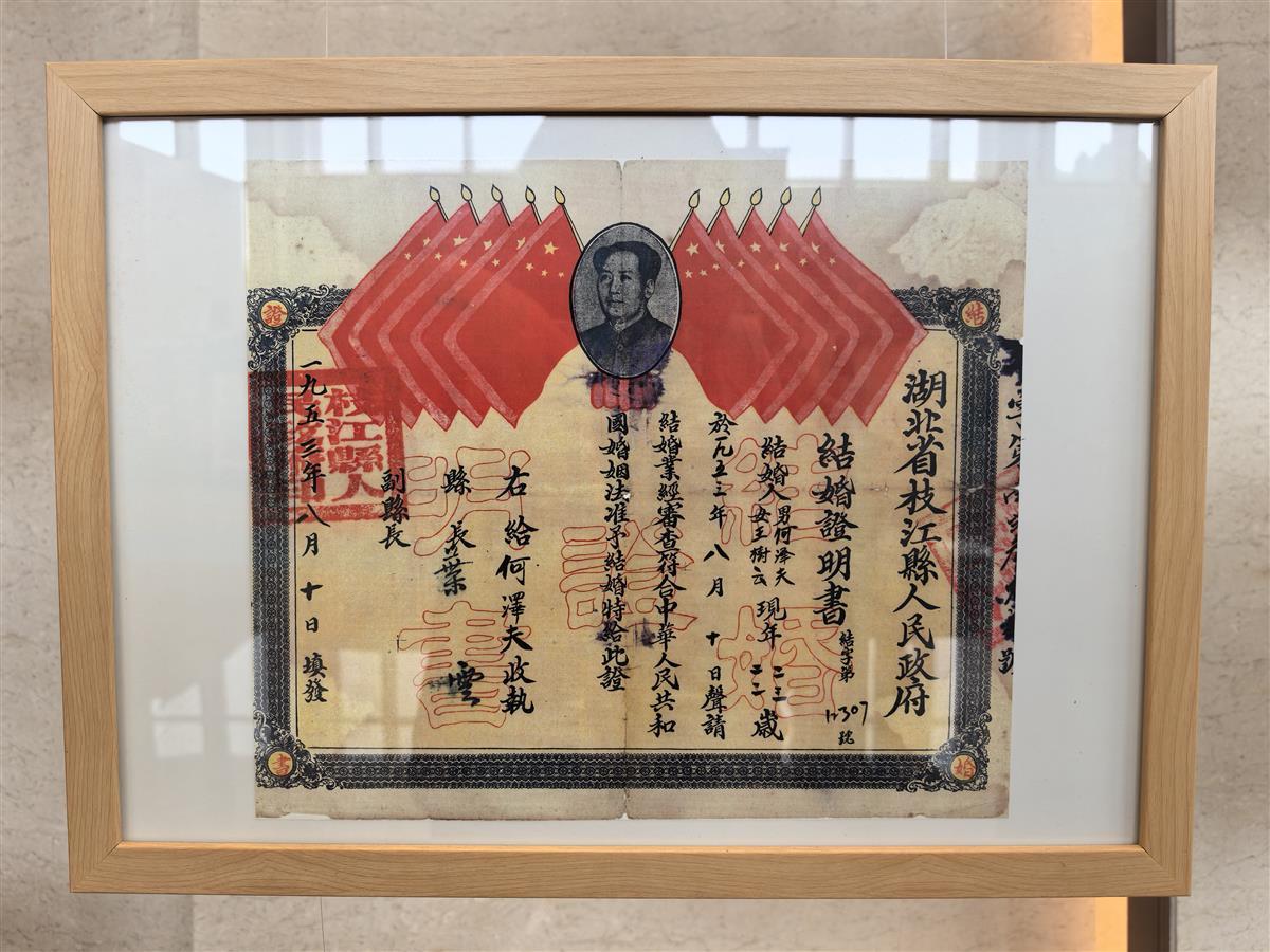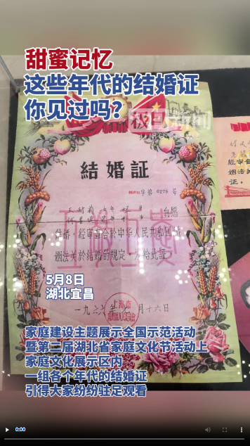 执子之手,与子偕老。结婚证,一个小小的证件是有情人爱情的见证。5月8日,在家庭建设主题展示全国示范活动暨第二届湖北省家庭文化节活动上,家庭文化展示区内,一组各个年代的结婚证引起了大家的好奇,纷纷驻足观看。