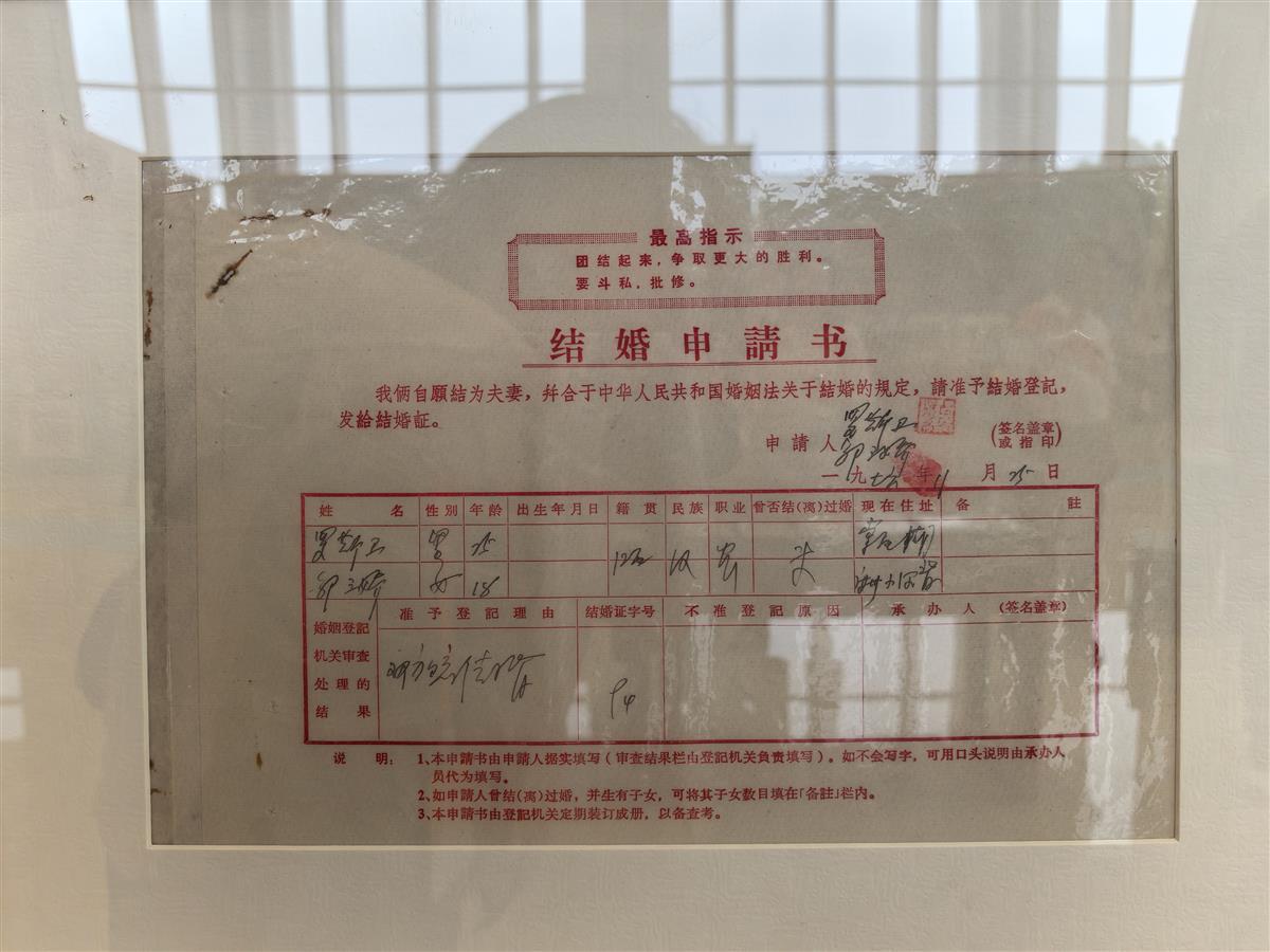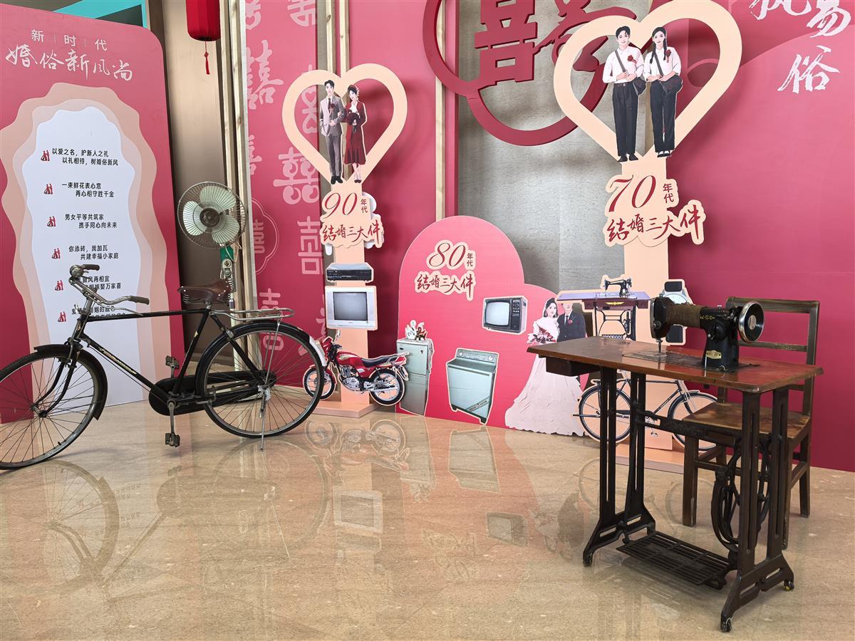 在不同年代结婚证展示区旁边,还展示了过去结婚时的“三件套”。在50、60年代,一只热水瓶、一个脸盆就能结婚;到了70年代,“三转一响”,即自行车、缝纫机、手表、收音机成为标配;到了80年代,结婚三件套又变成了电视机、洗衣机、冰箱;90年代又有了一些新变化。到如今,提倡的是“一束鲜花表心意,两心相守胜千金”“拒绝高价彩礼”等婚俗新风尚。