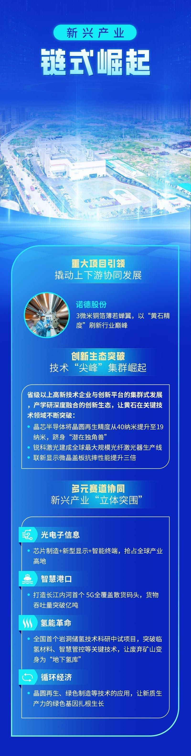 向“新”而兴,重在生态赋能。黄石深谙“独木难成林”法则:政策端,全省首创“未来产业十条”布局氢能等赛道,废弃矿洞变身“地下氢库”;人才端,“共享药房”“芯片机器人”等项目聚天下英才;场景端,长江首个5G码头、氢能公交网络为新技术的应用铺路。这种“技术-场景-集群”的生态闭环,让单点突破裂变为产业爆发——正如岩洞储氢撬动千亿布局,黄石正将“创新变量”转化为“发展增量”。