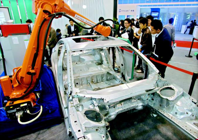 第八届光博会,华工科技的展台,摆放着一辆标致508的白车身。(资料图)