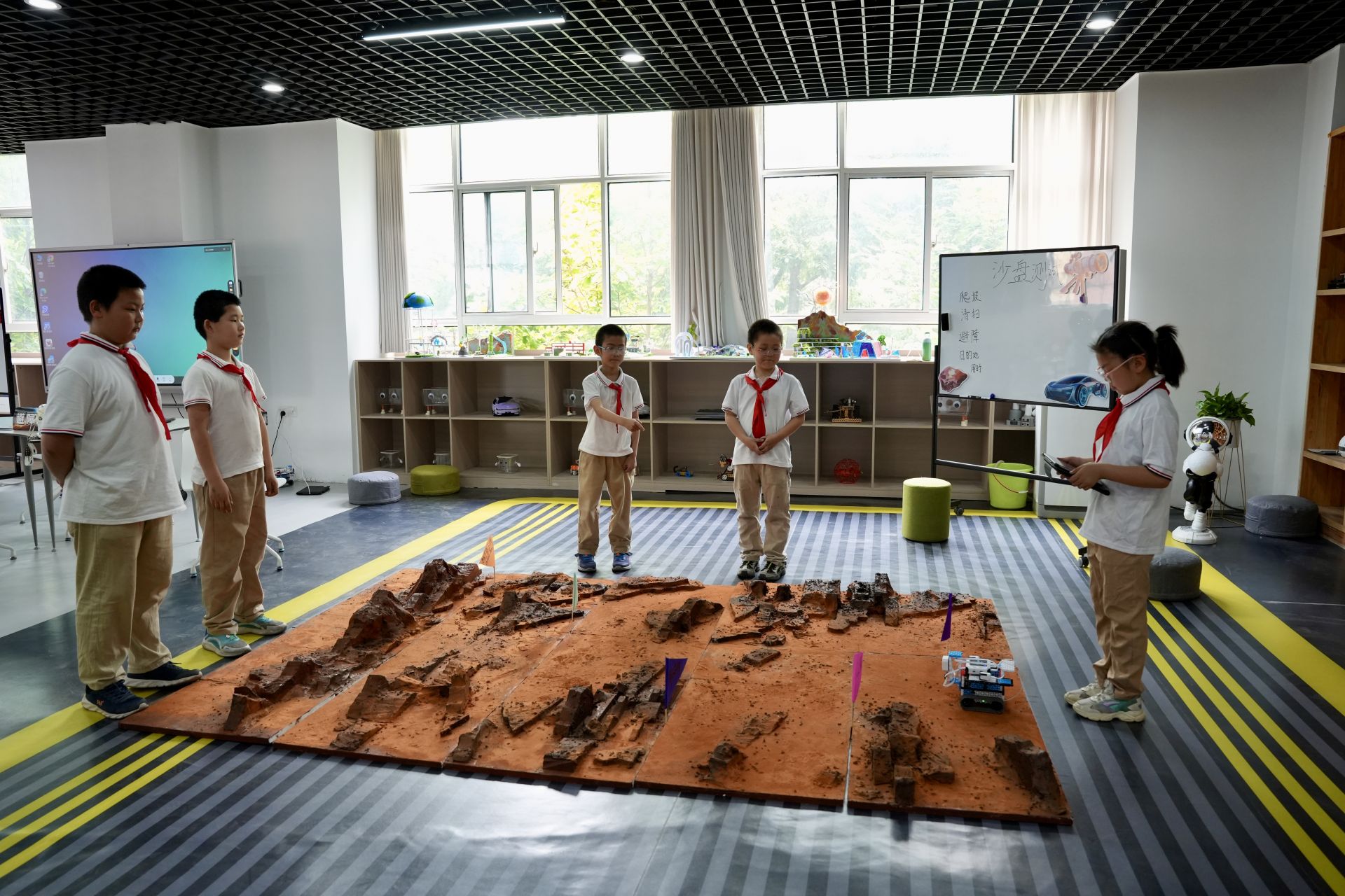 同学们在自制火星沙盘上进行模拟测试