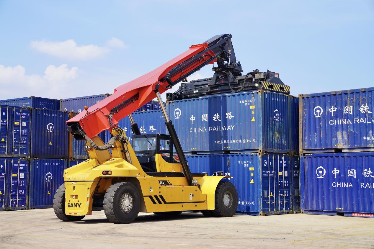 在中老铁路万象南铁路货运口岸站,起重机正在吊装集装箱。刘莹嘉摄