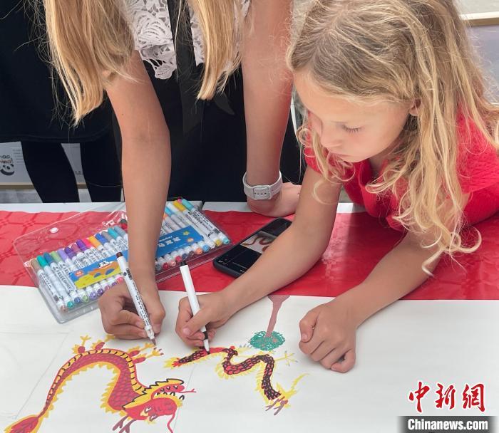 展览邀请小观众现场创作一幅画卷,两位比利时小朋友绘制了两条“中国龙”。中新网记者 德永健 摄