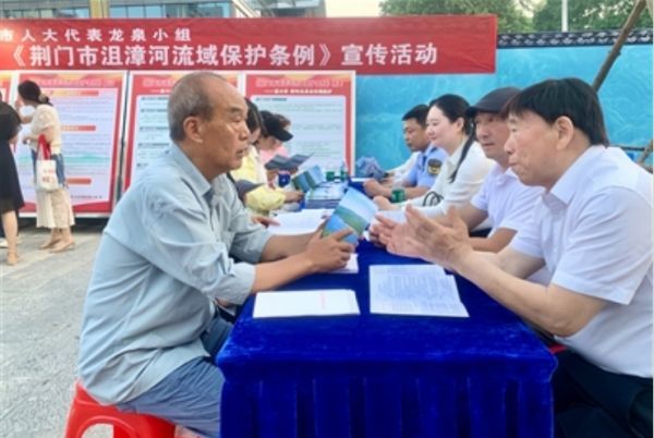 当日18时30分,市人大代表龙泉小组《荆门市沮漳河流域保护条例》宣传活动率先开启。代表分成两队与市民展开互动,发放条例宣传资料,解答咨询。