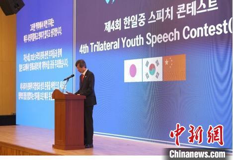 5月23日,第四届中日韩青年演讲比赛在韩国釜山举行。图为中日韩合作秘书处秘书长李熙燮致辞。中日韩合作秘书处 供图