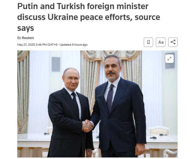 中新网5月28日电 据路透社当地时间27日报道,土耳其外交部消息人士称,俄罗斯总统普京和土耳其外交部长费丹在莫斯科会晤,讨论了结束乌克兰危机的努力以及俄乌双方直接谈判以来取得的进展。