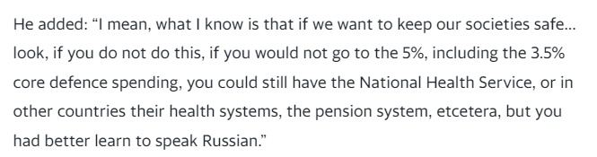 吕特说:“如果你们不(把军事化支出)提高到5%,包括3.5%的核心国防开支,你们仍然可以保留医疗系统、养老金系统等等,但你们最好学会说俄语。”